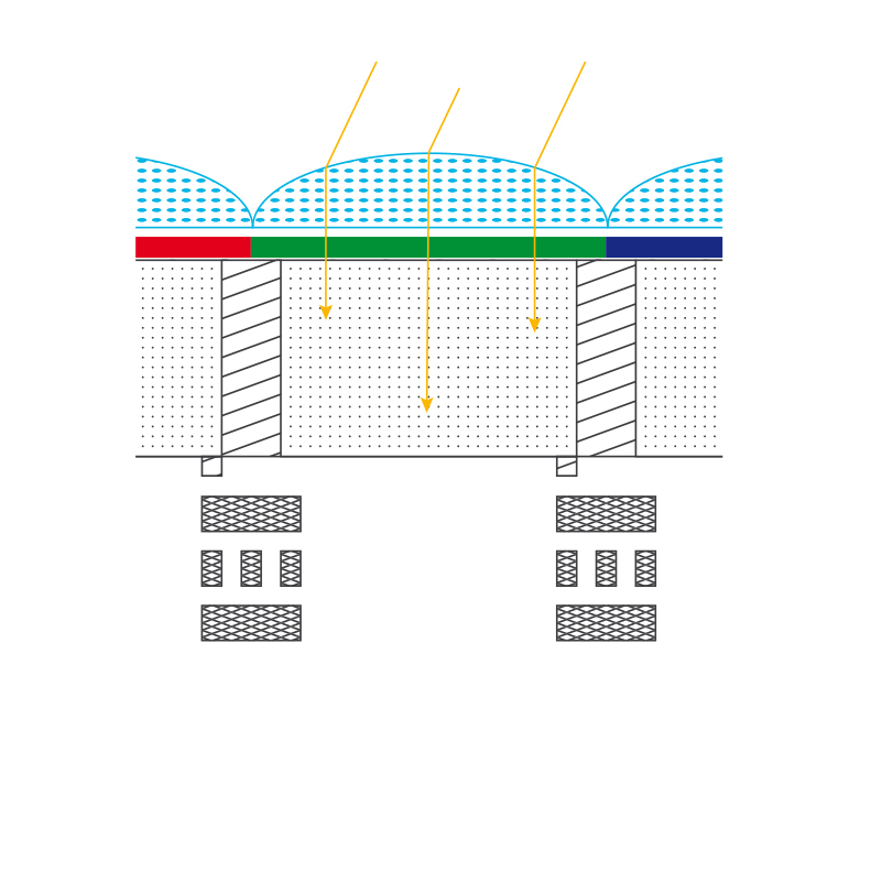 Sony hat die Sensoren auseinander genommen und ganz anders aufgebaut. Nun passieren die Photonen die Mikrolinsen und dann die Farbfilter. So weit so klar. Doch im Anschluss kommen sofort die Pixel.