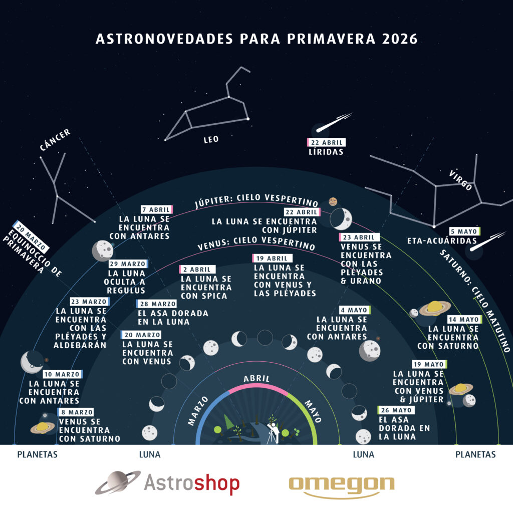 Nuestros “Astro Highlights Primavera 2026” te muestran todas las fechas importantes: el gráfico presenta de un vistazo los datos clave y, a continuación, el texto describe con más detalle los acontecimientos celestes.