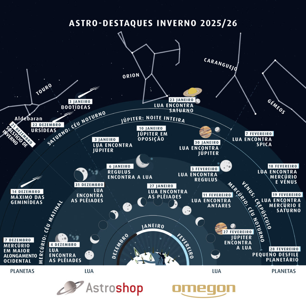 O inverno aproxima-se e com ele chega o período mais escuro do ano. Já no início da noite, o Hexágono de Inverno brilha no céu e convida à observação. Nos próximos três meses, há muito para descobrir no firmamento: desde as Gemínidas sem luz da lua a atrapalhar até ao brilhante Júpiter e até mesmo um pequeno desfile de planetas em fevereiro. Os nossos novos destaques astronómicos acompanham-te nesta época: mês a mês, estrela a estrela.