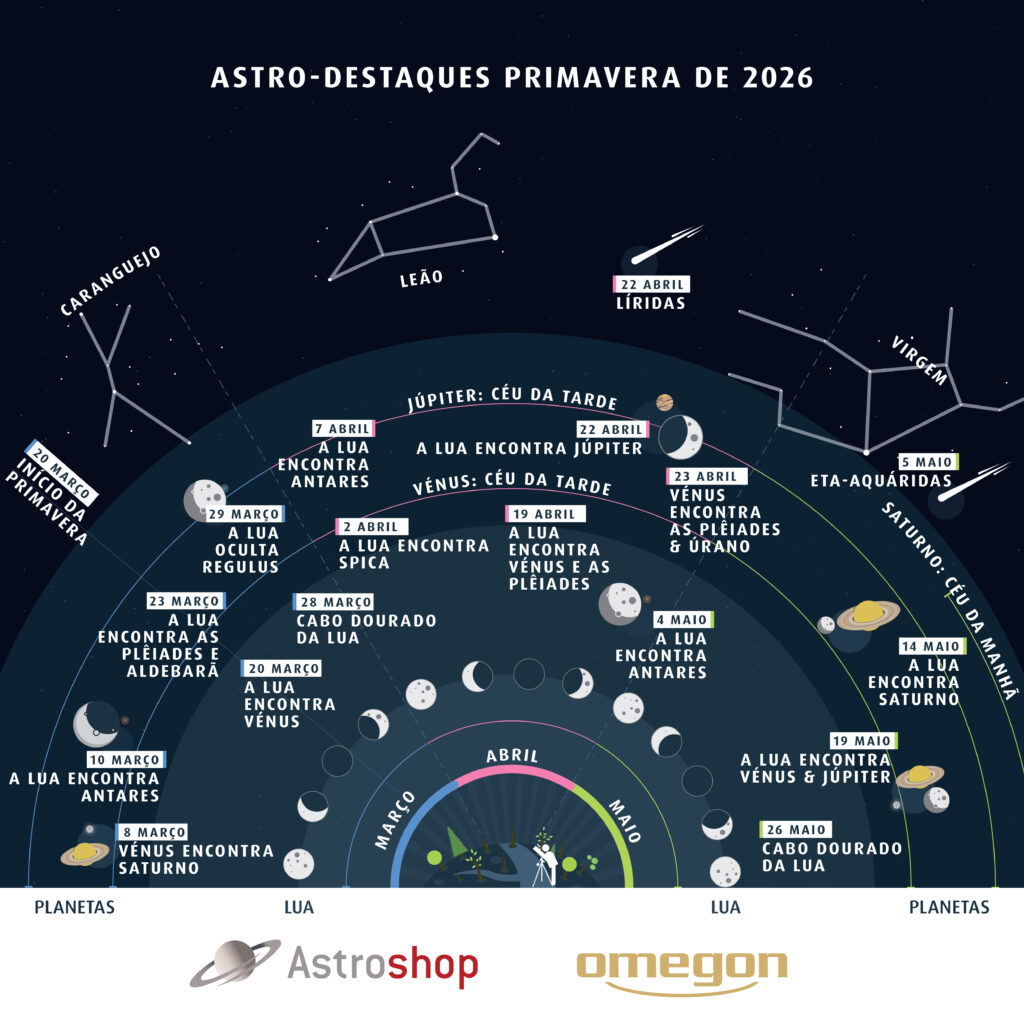 Os nossos “Astro Highlights Primavera 2026” mostram-lhe todas as datas importantes: o gráfico apresenta os principais momentos num relance e, mais abaixo, o texto descreve com maior detalhe os fenómenos celestes.